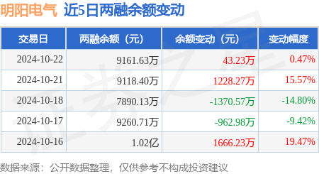 本站消息,10月22日,明阳电气(301291)融资买入1400.7万元,融资偿还1354.09万元,融资净买入46.61万元,融资余额9121.59万元,近20个交易日中有14个交易日出现融资净买入。